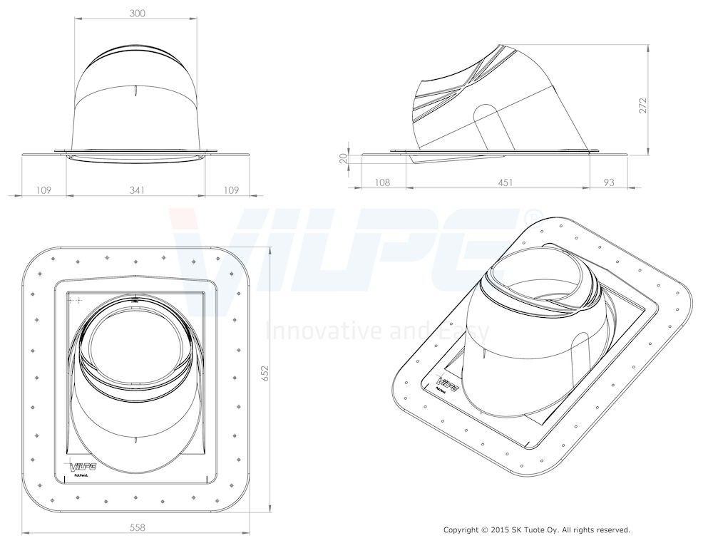 Комплект Piippu NO.1 призначений для герметизації виведення круглих металевих теплоізольованих димових труб діаметром 200-265 мм на всі види покрівлі, крім бітумної. Для монтажу необхідний ущільнювач гідрозатвори, який не входить в комплект і отримується окремо. Для полегшення монтажу прохідного елемента на фальцевой покрівлі додатково купуються кріпильні планки.